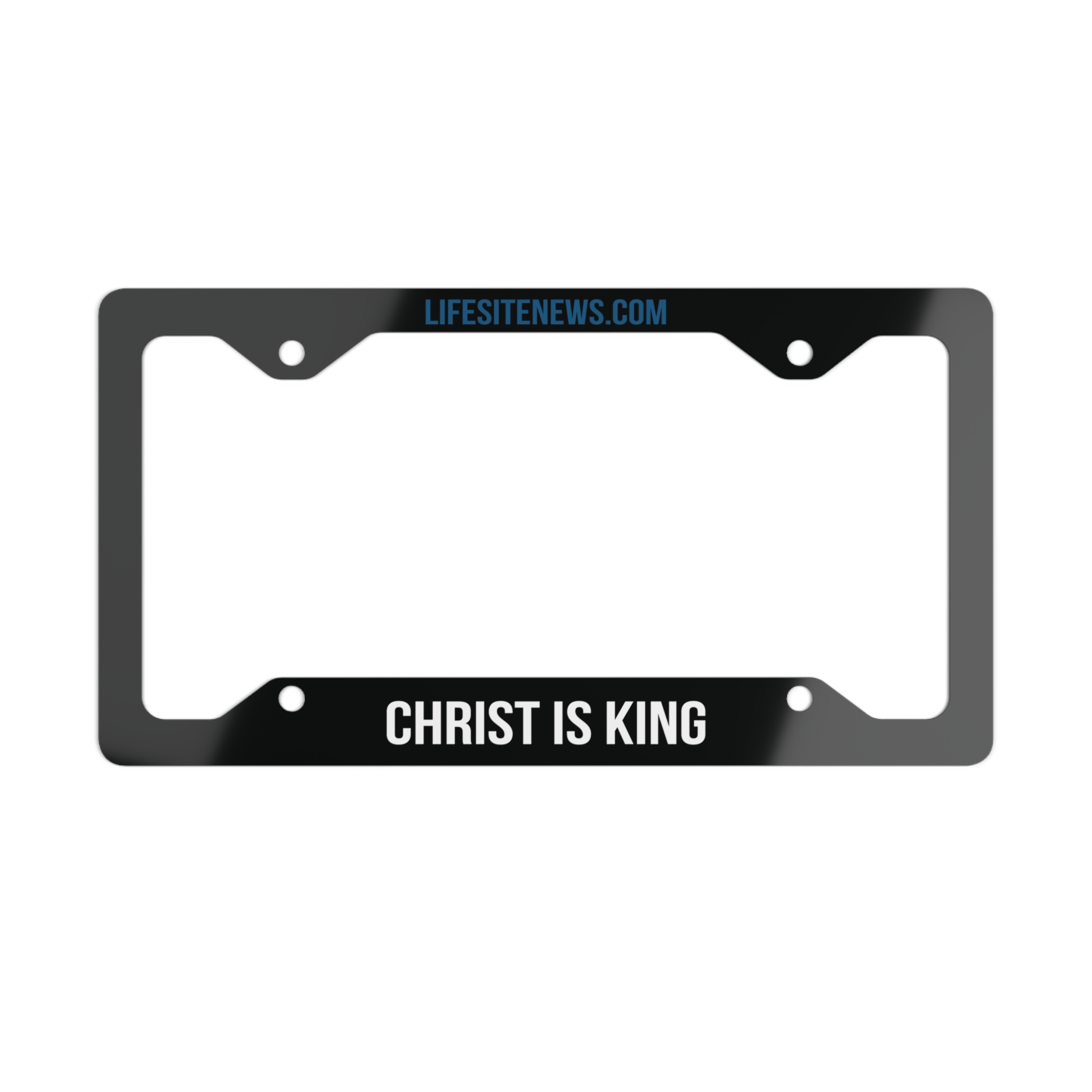Procaim the truth that Christ is King with this metal license plate frame. Made with a white aluminum base with a slick glossy finish and a silver backing, this frame has a unique shape for high information visibility. All plates come with pre-drilled holes for easy installation and are available in one size: 12.3″ x 6.5″ (31.1cm x 16.5cm)